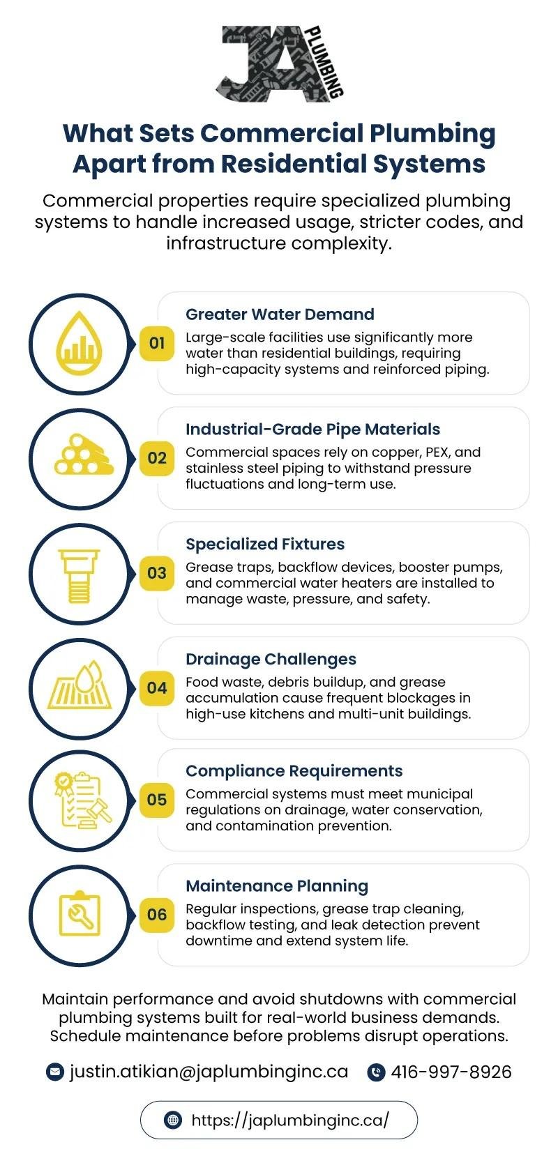 Commercial properties require specialized plumbing systems to handle increased usage, stricter codes, and infrastructure complexity. https://japlumbinginc.ca/infographics/what-sets-commercial-plumbing-apart-from-residential-systems/